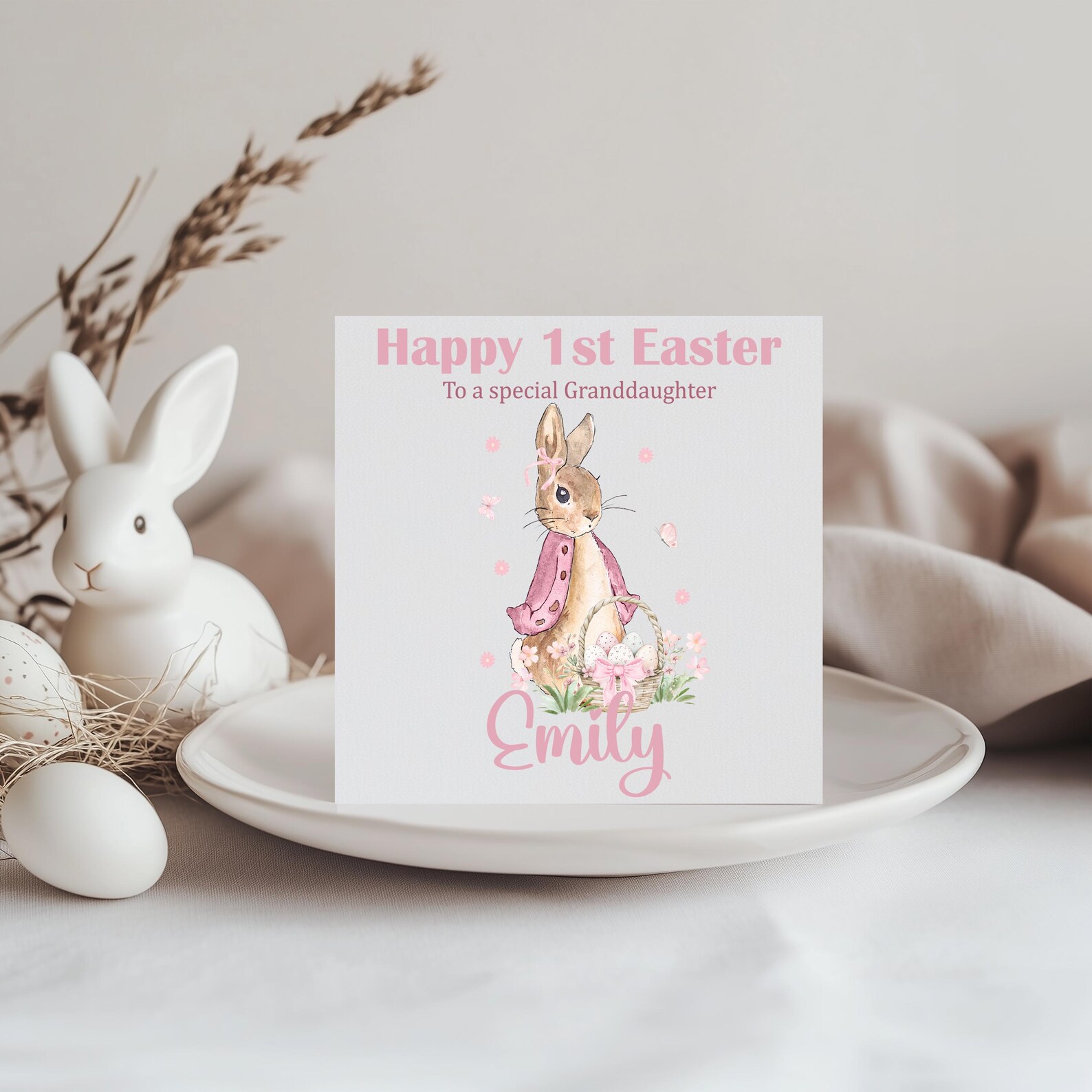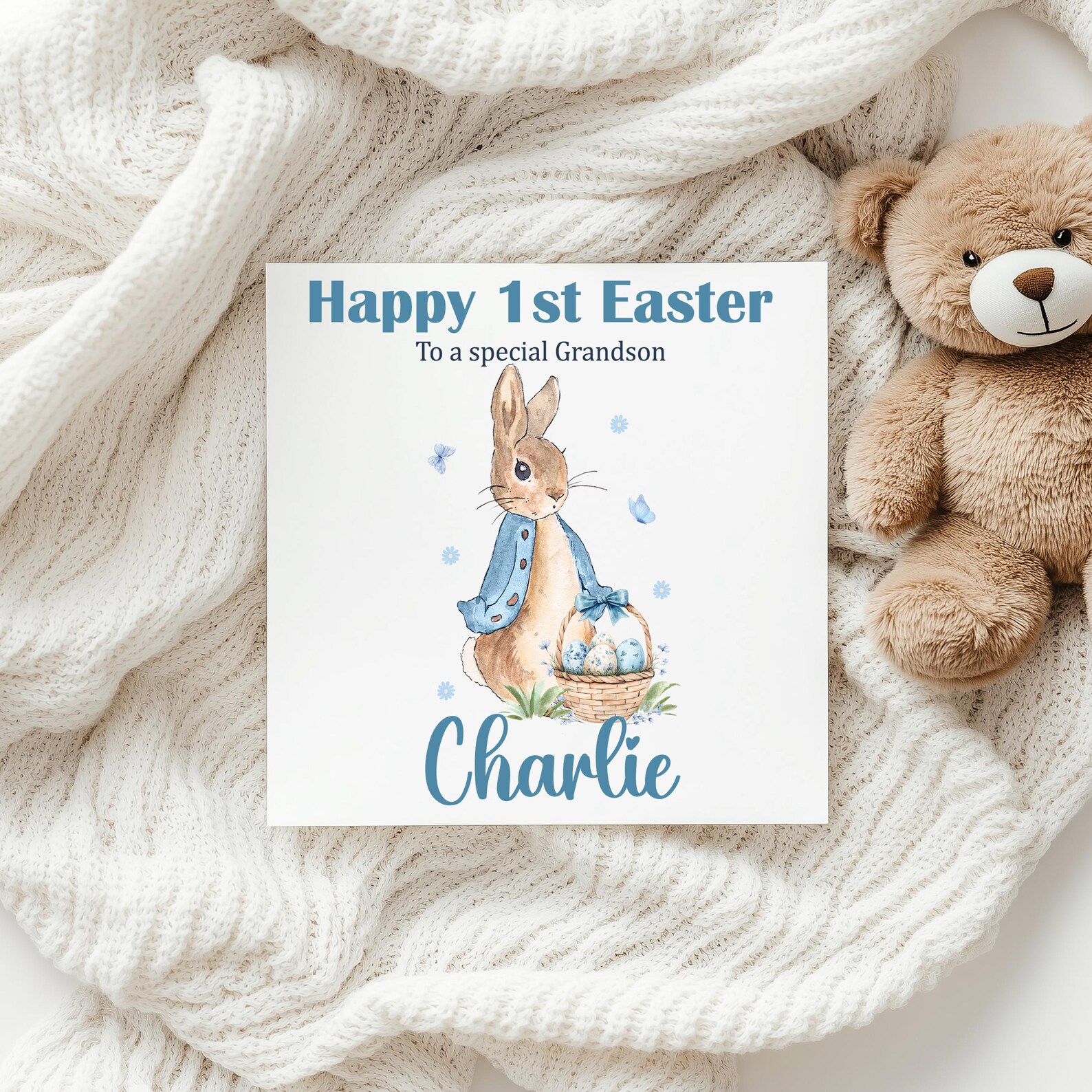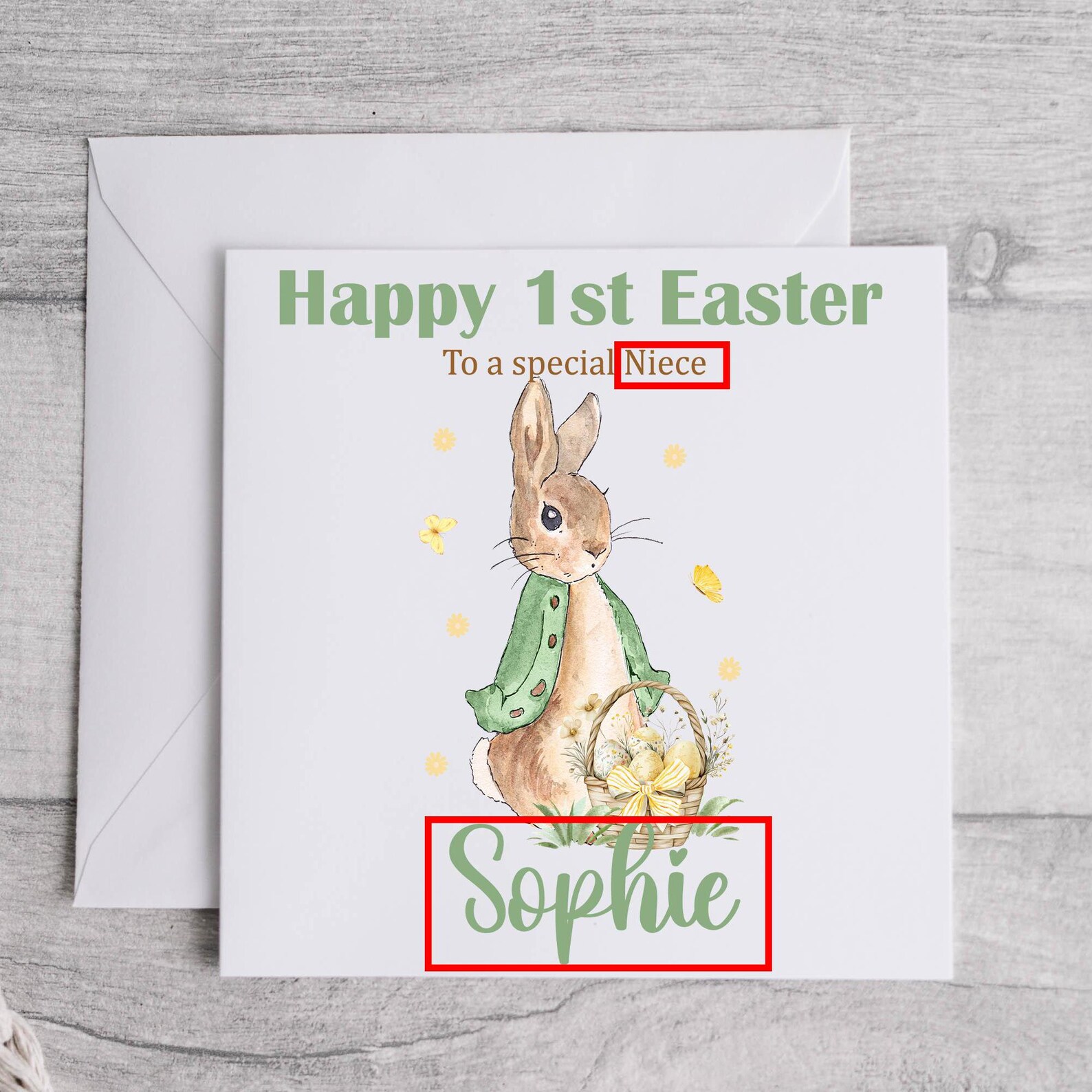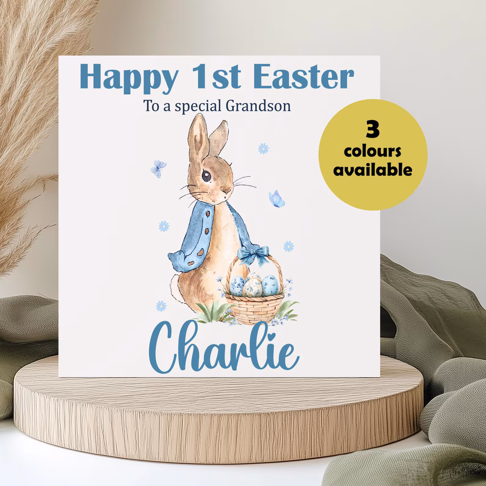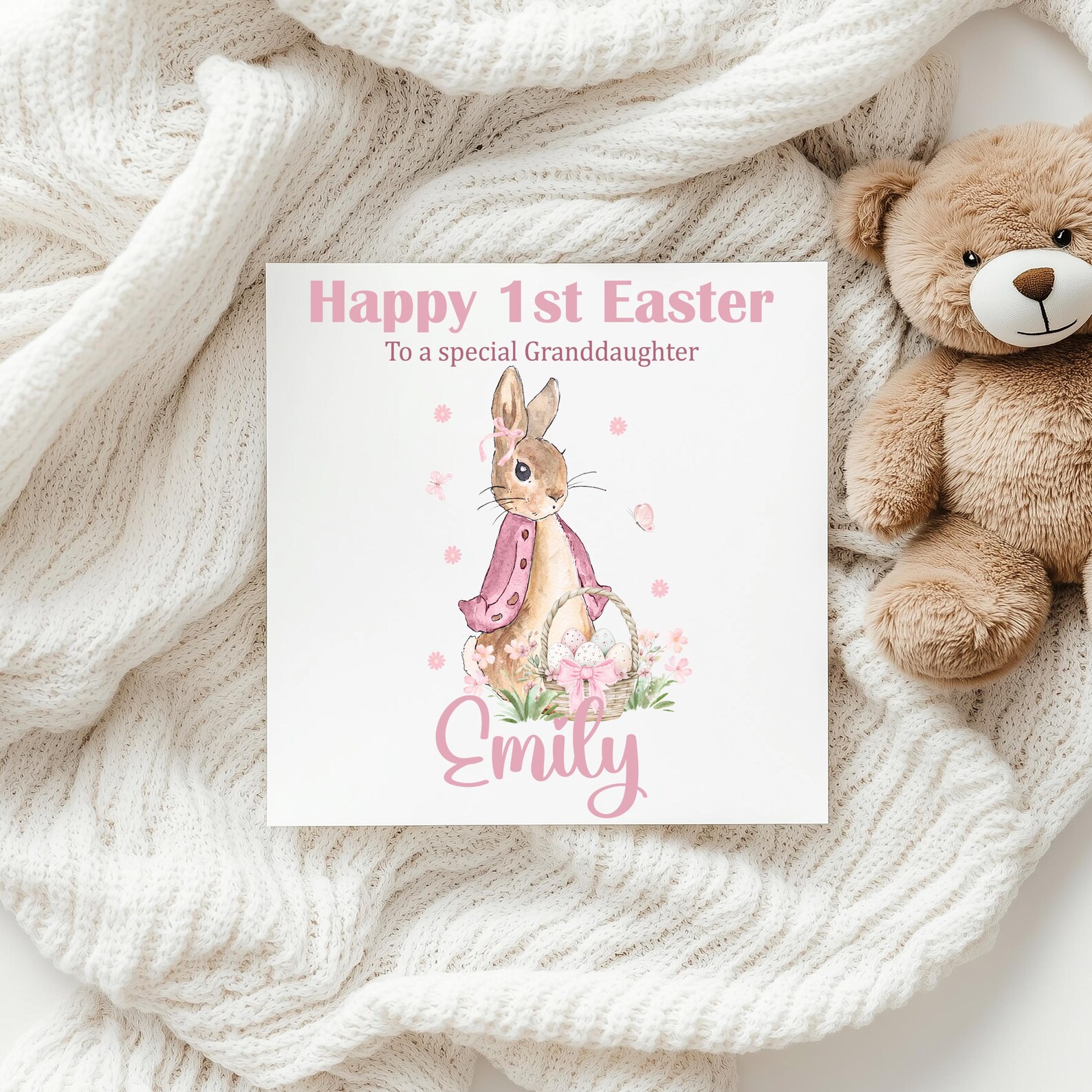 Celebrate your little one’s 1st Easter with a beautiful, personalised Easter card! This charming card features an adorable bunny holding an Easter basket filled with colourful eggs, making it the perfect keepsake for a special occasion.