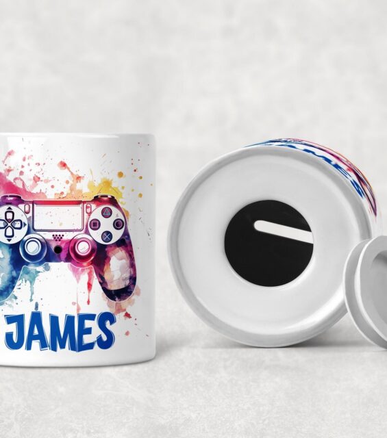 Personalised Gamer Money Box: Watercolour Game Controller